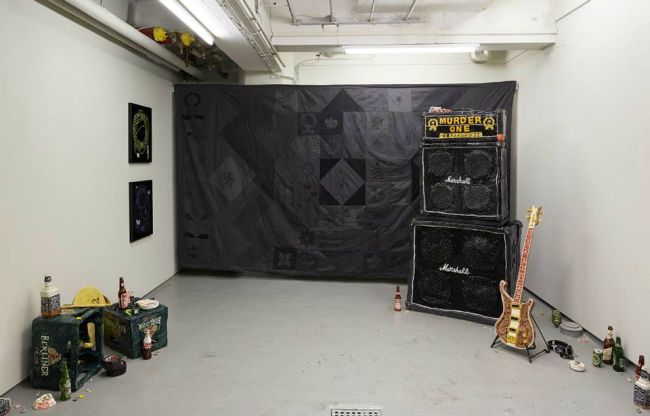 Rose Eken: MURDER ONE; Marshall amp, bass guitar, Black Quilt, tinsel paintings, ceramic crates and mess, V1 Gallery 2013. Photo: Jan Søndergaard