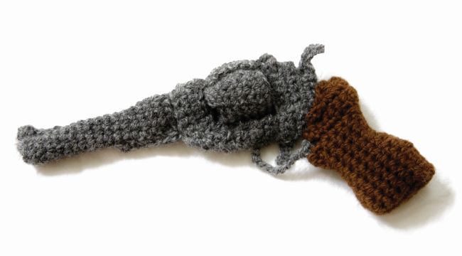 Hanne G: Six Shooter. A wool gun. What Trine is talking about when she says contemporary artists are not shy when it comes to choice of materials