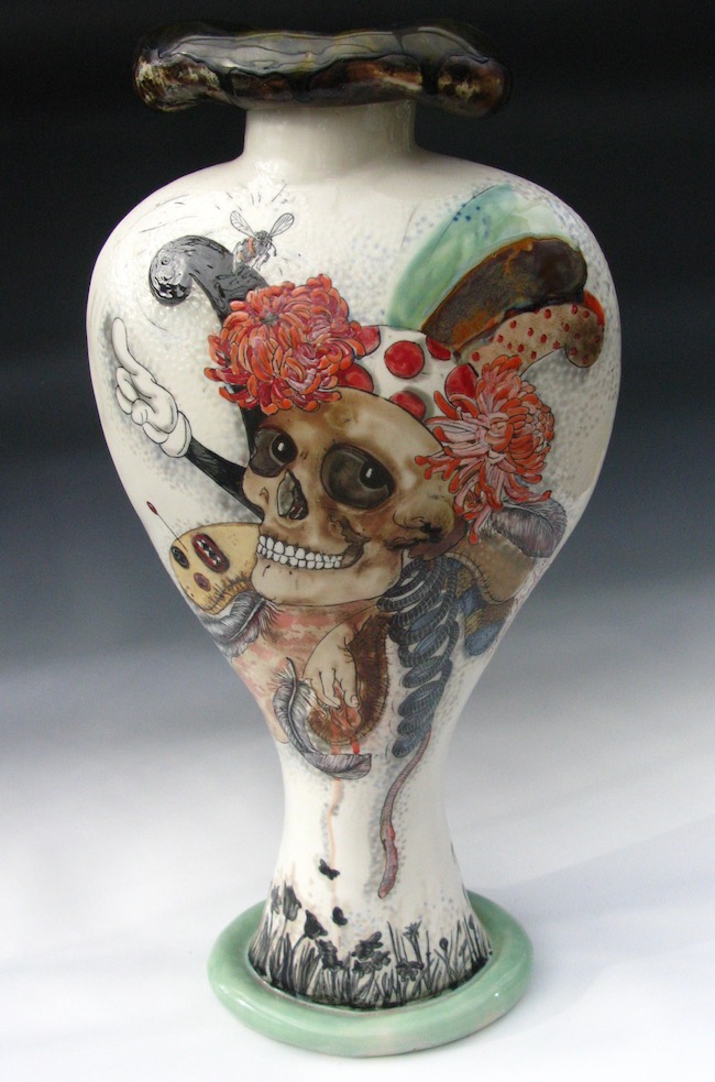 The intentions of SkujaBraden are found within the forms, and can be attributed to the drawings on them and the acute attention to detail – such as the color and design that play off of a sleek form that combines the aesthetics of ugliness and beauty, all in one. Their large porcelain vase, Life and Death, highlights a centrally-placed skull that sprouts flowers like Mickey Mouse ears as it floats on a collar of hand-sewn sacks resembling voo-doo dolls; also illustrated on the vase are juicy female genitals with fingers in them, feathers, and a springy worm that (like a Jack-in-the-box) props the image up above a foreground of black flower silhouettes. The piece suggests death, but it is more about life.