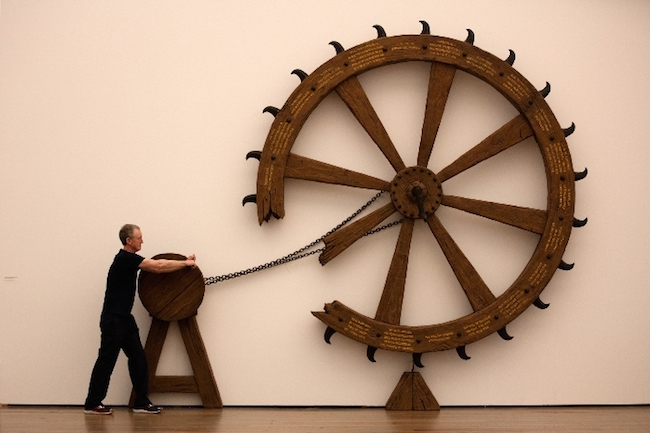 Michael Landy operating “Spin the Saint Catherine Wheel and Win the Crown of Martyrdom”, 2013. Installation view. © 2016 Museum Tinguely, Basel. Photo: Matthew Lee