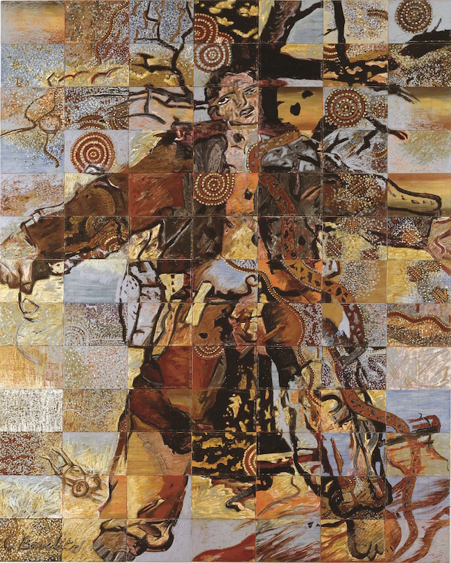 An enduring mark of Tillers’ art has been the use of quotes, references, and appropriation. He has never been afraid of borrowing characters from others; the works and texts of others have been a notable conceptual starting point – a base upon which he builds and develops his message. At the 1986 Sydney Biennial, Tillers exhibited his work The Nine Shots, in which he used images taken from the painting Five Dreamings by Aboriginal artist Michael Nelson Jagamara. Tillers was unprepared for the resulting accusations of copyright infringement and appropriation of Aboriginal imagery since, up to that point, citing others had been a common method and regular instrument for him. Tillers says that after the incident, he didn’t want to engage much with Aboriginal art. However, something rather unexpected happened fifteen years later – Imants Tillers and Michael Nelson Jagamara became partners in the creation of large-format paintings. Trusting and supplementing one another, a series of canvas boards (much like the pieces of a jigsaw puzzle) travel from one artist to the other, and, in the end, are joined together to create one large-format artwork. It turns out that this piecemeal method of connecting an impressive number of canvas boards, which immediately brings to mind the above-mentioned jigsaw puzzle, arose from both the wish to expand the boundaries of painting and, for practical purposes, to simplify the logistics of transporting large-format paintings from Australia to other continents. Today, this ‘puzzle-effect’ has become a specific idiosyncrasy of Tillers’ oeuvre.