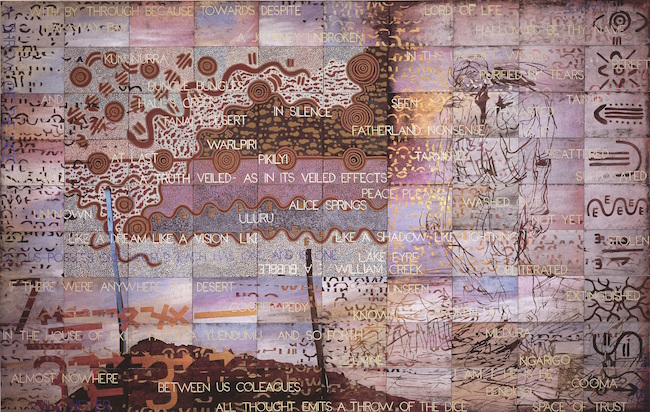 Imants Tillers and Michael Nelson Jagamarra. Fatherland, 2008. Synthetic polymer paint, gouache on 90 canvasboards, nos. 228 x 356 cm. Private Collection, Brisbane