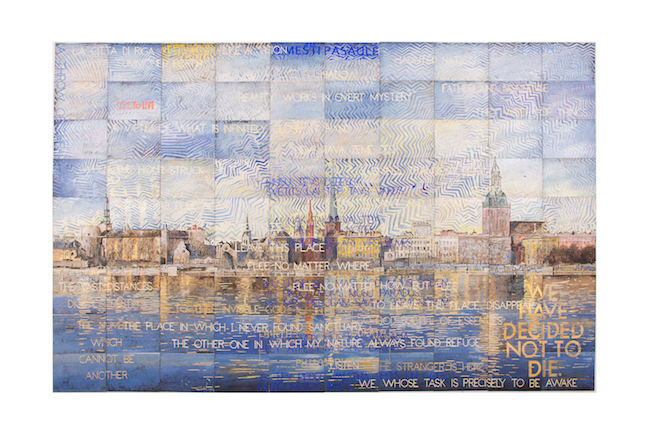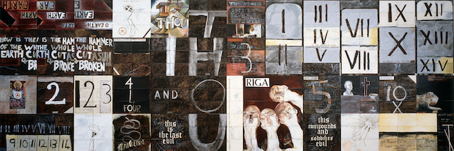 Arterritory.com met with Imants Tillers in Riga, at the Latvian National Museum of Art, which in July of 2018 will present a broad retrospective of Tillers’ work titled Ceļojums uz nekurieni / Journey to Nowhere. ‘The exhibition in Riga is a tribute and testament to my parents, Imants and Dzidra, who arrived in Australia as “displaced persons” in 1949 on the Dutch ship Volendam after the longest journey of their lifetimes. I was born the following year, in 1950, in Sydney. My exhibition, indeed one could say my work, is all about “belonging” and “not belonging” – about relationships between a “fatherland” and its diaspora. In many ways, this is almost the universal leitmotif of the 20th century. Much of the contemporary world, at least what is called “the new world”, is populated by the descendants of refugees and immigrants, most notably Australia (let’s forget about the convicts, but never forget the collateral damage done to the Aboriginal people!).’ This is how Tillers commented on the forthcoming Riga exhibition in November 2017, at the opening of his show at Sydney’s Roslyn Oxley9 Gallery, which included one of the pieces which will be on view in Riga. In fact, the piece is titled exactly the same as his upcoming solo show in Riga, Journey to Nowhere, and is a pronounced concentration of Tillers’ conceptual and formal thinking. At 229.5 cm x 356 cm in size, this classic view of the Riga skyline (a postcard shot which most every Latvian living in the Soviet era had sent to their friends and relatives in the West) consists of 90 painted cardboard panels. Text overlays the image; or more precisely, phrases overlay it. Upon googling the boldest, and perhaps most emotional, phrase – ‘We have decided not to die.’ – the top results reference a 12-minute Australian short film with the same title.