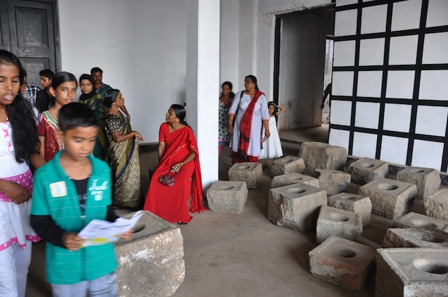 One of the most poetic pieces in the biennial is the installation Grinding Stones (2012), by Indian artist Sheela Gowda. Half a century ago, every house in Kerala had a special stone for the grinding of spices. In a sense, this stone was the soul of the house – every day, the woman of the house would use a pestle to grind the spices for the day's meals – and so it went, through the years and for numerous generations. The stone block would weigh somewhere around 200 kilograms, and once it was put in place, there it would stay. No one grinds their spices like that in the Indian households of today – now they use electric grinders. But of course, the aroma is not the same anymore. With the rising of real estate prices, many of the old buildings are plundered and then knocked down, and new ones – without any history to them – are erected in their place. Understandably, the old stones don't have a place in these new buildings and – just like cows that no longer give milk and are, thereby, set free to wander the streets – these stones are thrown out somewhere nearby, where they slowly grow over and meld into the environment, and no one takes any notice of them anymore. In her installation, Seela Gowda seeks to activate this old story: in one of the old warehouses she has arranged 170 of these ancient spice-grinding stones – each one marked with its own ravages of time – in a symbolic road that winds through the warehouse's large doors and outside, in the direction of the canal – the one-time vein of the spice trade. Today, the canal carries barges and small motorboats with tourists. Indian women, dressed in saris, enter the space and tend to sit down on the stones to chat with their companions, just like they would by a hearth; meanwhile, their husbands weave their way among the stones as they go outside and head towards the canal to look at the boats.