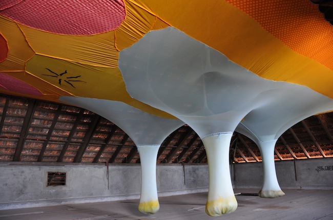 The installation Life Is a River (2012), by Brazilian artist Ernesto Neto, has been exhibited in the attic of a 400-year-old building which was once a coconut-fiber processing factory. To see the piece, one must climb up a dusty wooden ladder and through a hatch that leads up to the attic; optimally, without banging your head along the way. The air is so thick and heavy in this attic overheated by the sun that you can almost stir it like a dish of curry; which, as it happens to be, is what lies inside Neto's famous “bags of spices”. The orange fabric that makes up the lycra “socks” stuffed full of spices – which look a little bit like swollen cow udders – was found by the artist right there in Kachi's local marketplace. Through the cracks in the ceiling beams, one can just make out the river. Neto's piece in the biennial is a scented variation of his “monsters”, which began their marathon of popularity at 2001's Venice Biennale; there they had gained the status of “must-see objects”. The year before last, a related large-format installation by Neto could be seen at Rome's museum of contemporary art, Macro. If the piece at Macro was considered intriguing and slightly exotic – a gigantic “jellyfish” of spices that shocked not only with its size, shape and refined tonalities of color, but also, as one stands there in the ascetic white cube, with its marked effect on the sense of smell, – then in the attic in Kochi, one has the feeling that the piece is in its true place – at home. And it fits in so organically that one could almost believe that curry has always been kept in socks. It's a brutal, untamed kind of beauty.