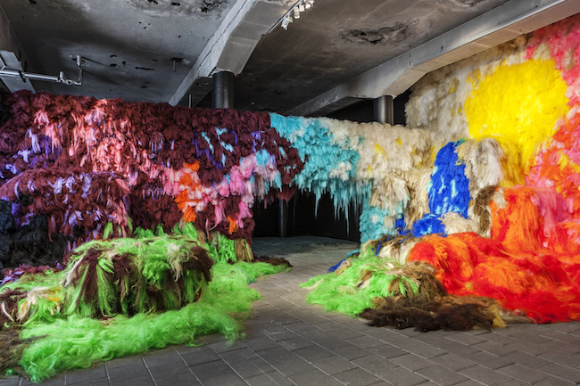 The biennale reflects international curatorial trends and showcases work by artists – from both the Nordic countries and further afield – that pertains to contemporary society and culture, all tightly curated within the over-arching concept of Tunnel Vision. Swedish artist Zhala, a founding member of the LGBT club ‘Donna Scam’, has created a soundtrack for the biennale – her ‘religious rave’ (or so-called ‘cosmic pop’) is on loop in two exhibition venues in which visitors are met with a cacophony of audio, visual and tactile experiences. Zhala performed during the opening. Issued in part to cover the increasingly important concept of ‘branding’, as well as to ensure that all the senses are engaged, a custom scent has been commissioned by the Norwegian scientist and artist Sissel Tolaas. The scent fills both main exhibition spaces, and visitors are encouraged to even touch the walls – which leave a lingering scent on your fingertips. Subsequently, entering the main exhibition space through the wall of fog created by Japanese artist Fujiko Nakaya – in addition to the strong scent and music – is a truly impressionable experience. “Tunnel Vision shows you how you are caught in your own tunnel vision, how you can be led to other visions, and that parallel tunnels exit into the world,” a guest commented during the opening.