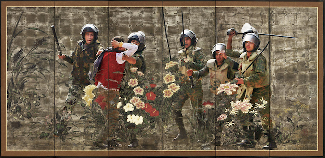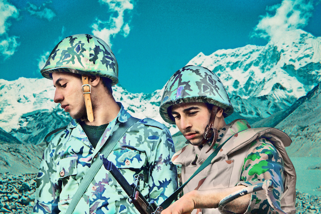 Where Ibrahimovic politicises his personal items through historical context, the Egyptian artist Nermine Hamman personalises the uniformed faces of power. When soldiers arrived at Cairo’s Tahrir square at the end of the January revolution of 2011, Hamman witnessed them, wide-eyed with tiny frames, squinting as they climbed out of their vehicles. In four works from the ‘Uphekka’ series (2011), portraits of soldiers photographed unwittingly and apart from the group are collaged onto the Technicolor idyll of vintage postcard backgrounds of mountains and pagoda covered terraces.