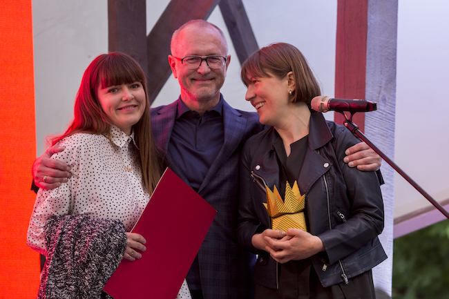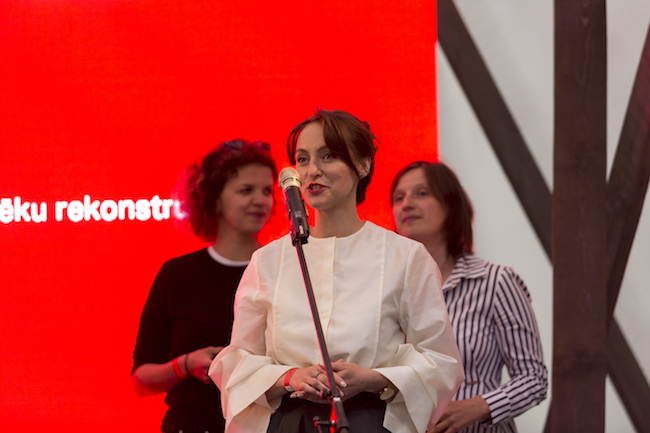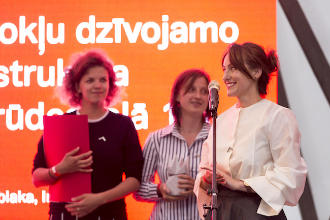 Trešo sudraba ananasu saņēma daudzdzīvokļu ēka Ģertrūdes ielā 121 un tās autori - Agnese Lāce, Renāte Pablaka, Inese Buša.