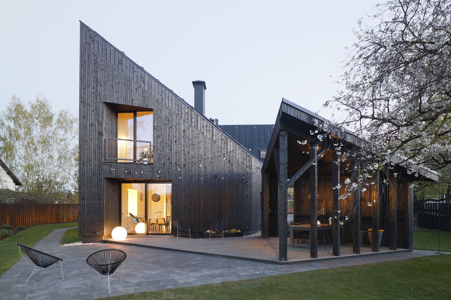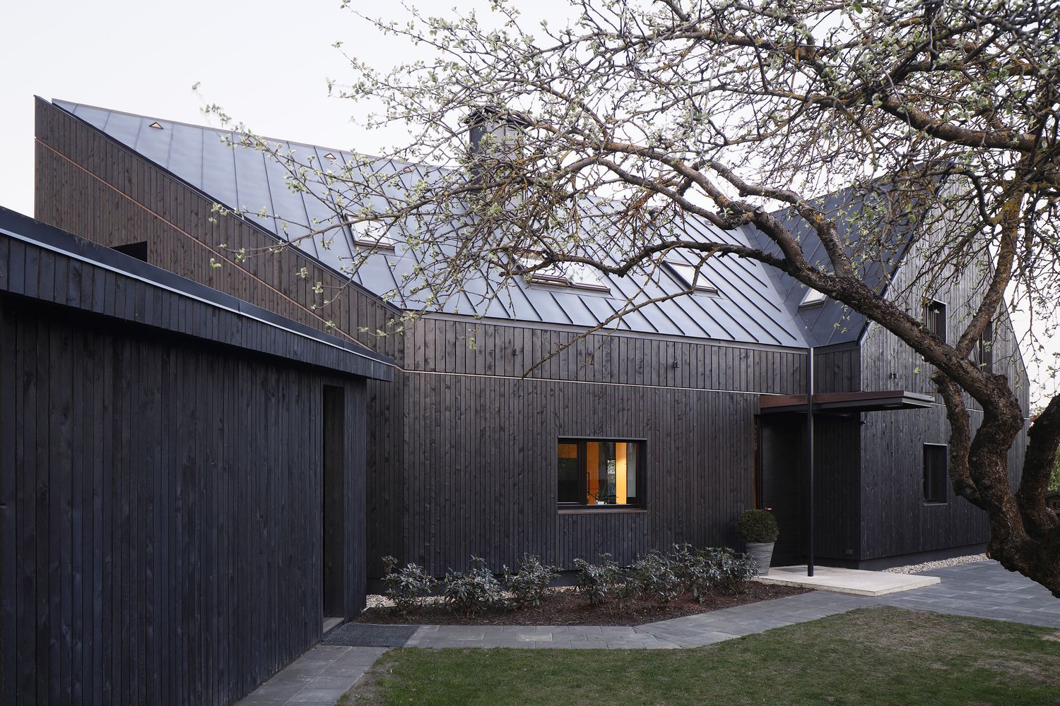 Dārzs un logu izvietojums plānots tā, lai būtu, kur aizkavēties skatienam. Dzīvojamā istabā un pie viesu ēdamgalda tie ir ceriņi, ieva un ģimenes iestādītais pīlādzis, kas norobežo ēku no ielas, aiz virtuves loga – vecie augļu koki un rododendru dobe, bet aiz brokastu loga – košumaugu dobe.