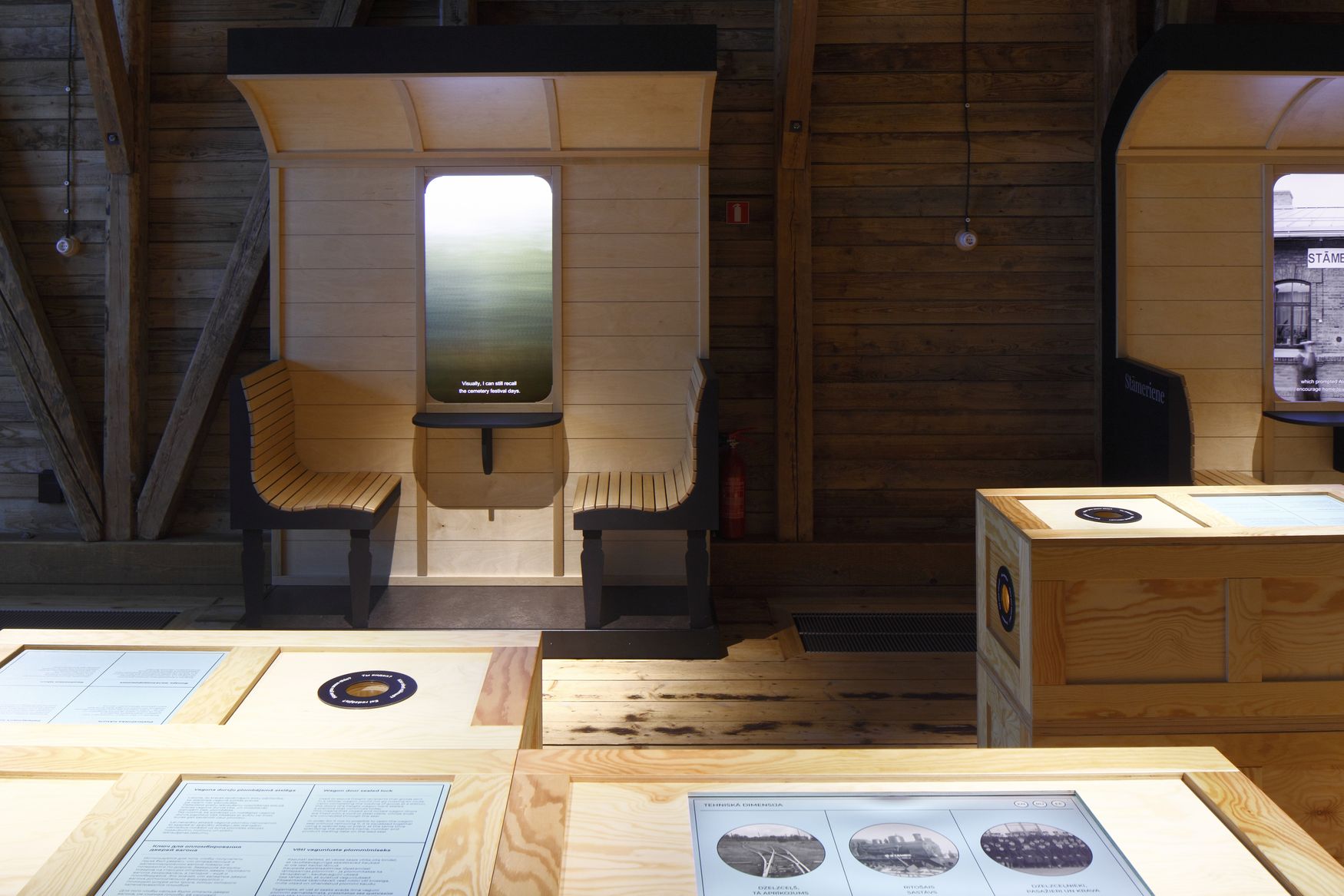 Pats bagāžas šķūnis izraudzīts par ekspozīcijas vizuālo kodu, un tas atklājas centrālajā elementā – interpretētajās bagāžas kastēs, kas preču vietā tagad glabā informāciju. Vienlaikus izstādes iekārtojuma veidolā rodama tieša vizuāla atsauce uz vilciena vagonu, ko pieļāvusi šķūņa lakoniskā, garenā telpas forma, dodot iespēju gar abām sānu sienām izvietot stilizētas pasažieru sēdvietas. Virs sēdvietām – vagona logos iebūvēti ekrāni, kur vērojamas reālā maršruta videoainavas un dzirdamas pasažieru balsis un ritošā sastāva klaudzēšana. Bagāžas kastes, kurās integrēti gan digitālie informācijas nesēji, gan autentiski eksponāti, stāsta par pārmaiņām, kādas savā 115 gadu ilgajā pastāvēšanas laikā piedzīvojis bānītis.