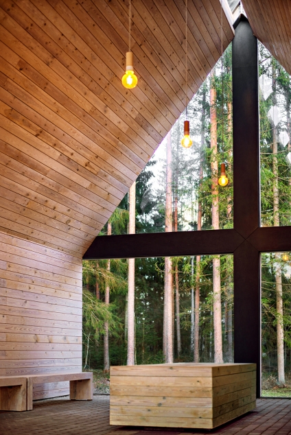 Mūsdienu pārmērīgi stimulēto redzi atpūtina ahromatisko krāsu lietojums – ēkas tumšā ārpuse ir kā skatuve koku un augu gaismēnu spēlei; ēkas gaišā iekštelpa ir fons ģimenes ikdienai. Iekštelpās kokam ir galvenā loma, tomēr svarīgi bijis to nepārdozēt. Koka grīdas ir siltas, pa tām patīkami staigāt ar basām kājām.