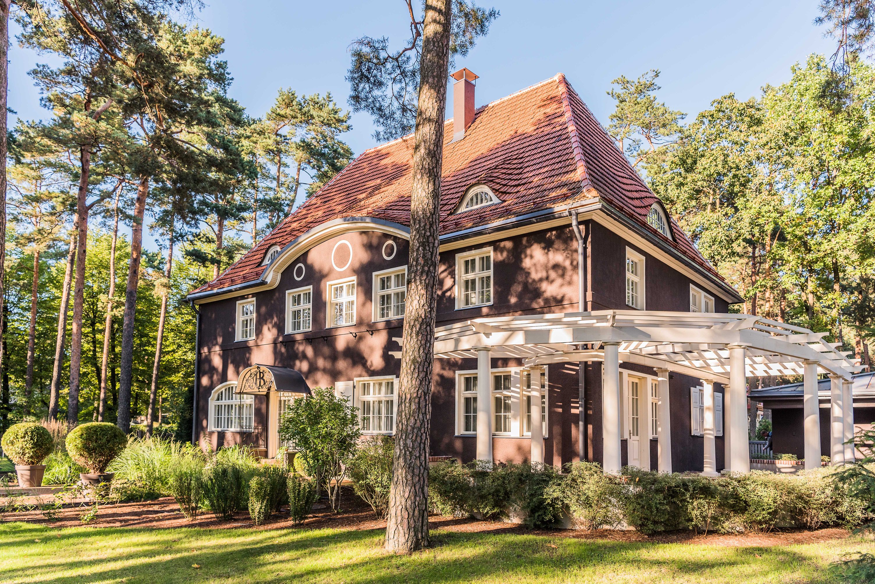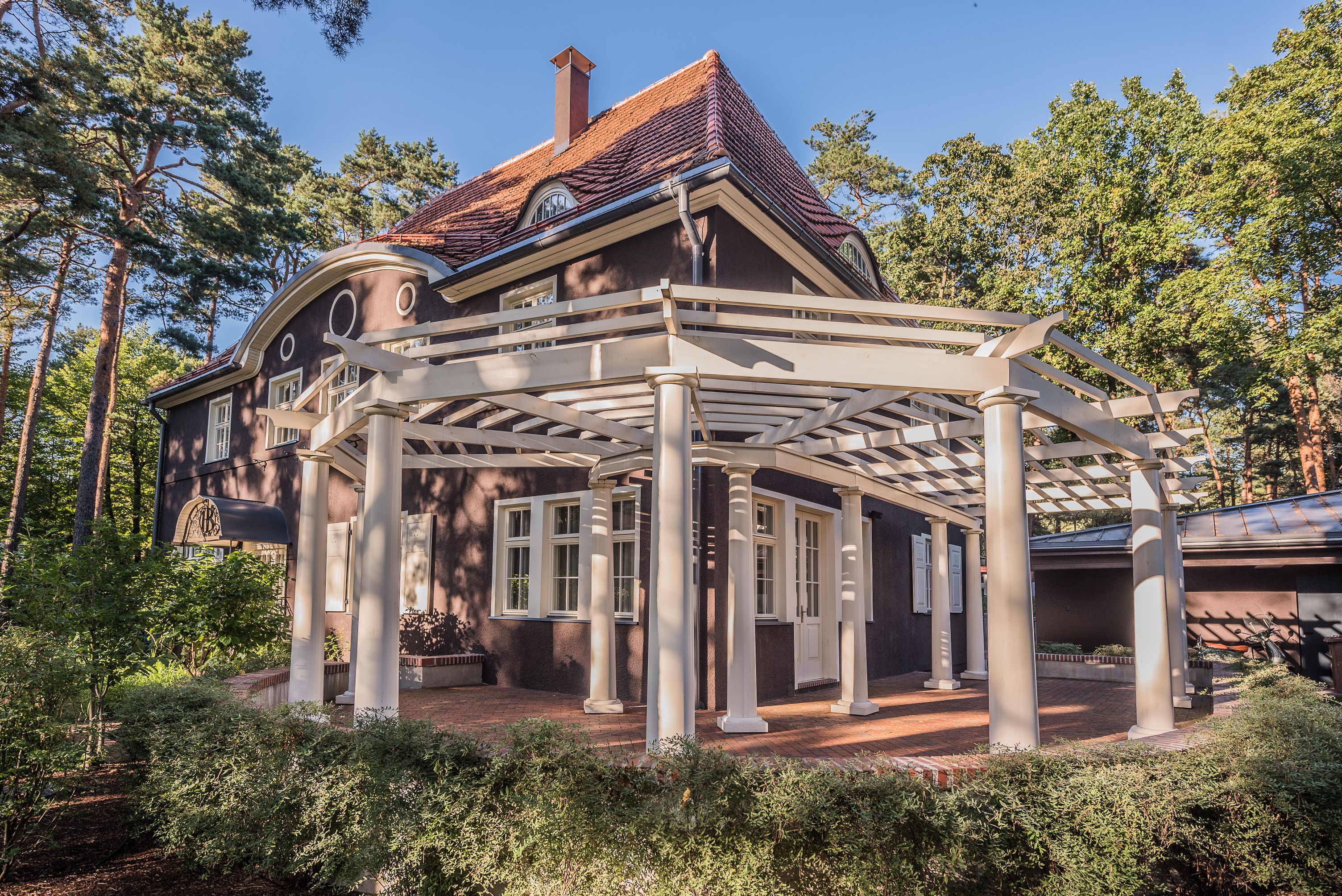 Pie kompaktā ēkas apjoma un esošās jumta formas saglabātas visas trīs sākotnēji projektētās ieejas ēkā un atjaunota ceturtā – terases – ieeja. Restaurētas vienīgās oriģinālās ēkas ārdurvis – Visbijas prospekta pusē, savukārt visas jaunās durvis izgatavotas, par prototipu ņemot F.V. Zeiberliha fasāžu zīmējumos redzamās ēkas ārdurvis dienvidu stūra verandai. Projektā saglabāts un eksponēts Visbijas prospekta pusē esošais vējtveris kā oriģināls ārtelpas un interjera elements. Ēka siltināta no ārpuses, izveidojot jaunu, oriģinālajam atbilstošu apmetumu. Rūpīgi atjaunots arī jumta iesegums – klasiskie māla kārniņi uz koka latām. Restaurēti esoši koka oderlogi, atjaunots zudušais spraišļojums ārējo logu vērtnēs, pēc iespējas saglabājot esošo logu furnitūru. Nepieciešamības gadījumā izstrādāti jauni logi pēc oriģinālo logu paraugiem, kā arī atjaunoti logu slēģi.