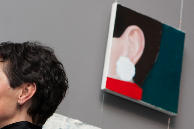 Māksliniece Zane Iltnere pie sava mākslas darba “Pašportrets ar mammas auskaru”: “Gleznot pašportretu ir šausmīgi grūti, piecas idejas jau pašā sākumā atmet, līdz nonāc līdz tai īstajai. Visu laiku arī paturi galvā faktoru, ka tik tu savā darbā neparādi kaut ko par daudz. Radīt savu pašportretu ir ļoti intīms process, un, manuprāt, auss ir ļoti intīma, tāpēc arī izvēlējos to attēlot tieši šādi. Gleznā redzama mana auss, kurā iekārts mammas auskars, otrs ir pazudis.”