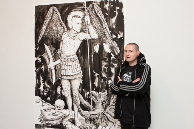 Mākslinieks Kristians Brekte pie sava pašportreta “Svētais”: “Man šis gads ir aizsācies tādā pašportreta zvaigznājā, jo palika 33 gadi – maģiskais skaitlis. Caur katru savu pašportretu es to izdzīvoju. Vienā darbā sevi attēloju ar nocirstu galvu, citā kā svēto, tad kā mocekli vai kā es rāpjos ārā no kapa. Esmu sapratis, ka ir baigi forši pēc kaut kāda laika redzēt savu pašportretu, kā tu sevi dokumentē. Šo gadu esmu veltījis sev.”