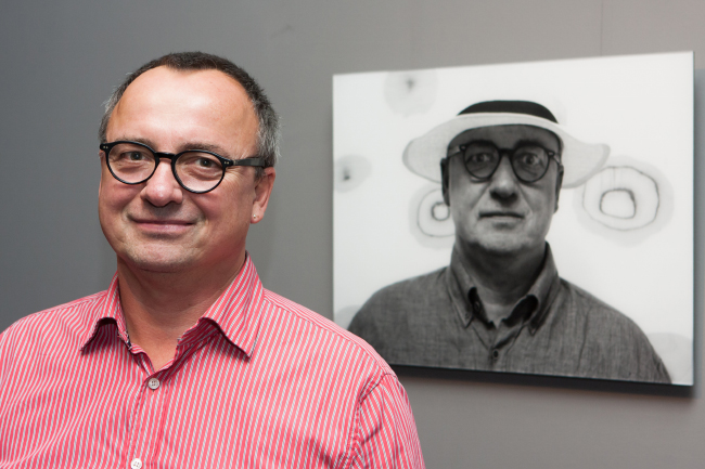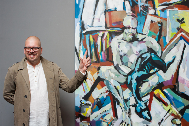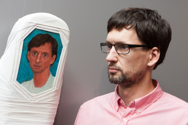 Mākslinieks Andris Eglītis pie sava darba “Glezna Nr. 64”: “Es nekad neko speciāli nevaru uztaisīt, biju paredzējis citu darbu, bet nesanāca. Pašportretā ir kaut kas no tā, kā tu vēlies sevi parādīt. Tu noteikti pret savu izskatu mākslas darbā izturies citādāk, nekā pret citu.”