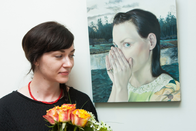 Māksliniece Tatjana Krivenkova pie sava darba “Pašportrets”: “Man samaitājās apakšrāmis, un domāju, kā lai tagad iztiek bez apakšrāmja? Un uz ko var visu ko izmēģināt vēl labāk kā uz sevi? Vēlējos sevi parādīt dziļāku, ne tik reālistisku, bet savu būtību.”
