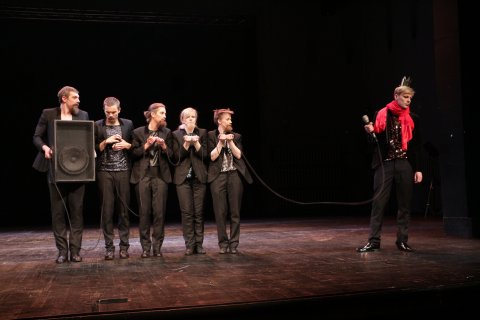Gata Šmita izrāde “Pirmie aplausi”, kuras scenogrāfiju veidojis Rūdolfs Bekičs. Jaunais Rīgas teātris, 2013. Foto no JRT arhīva