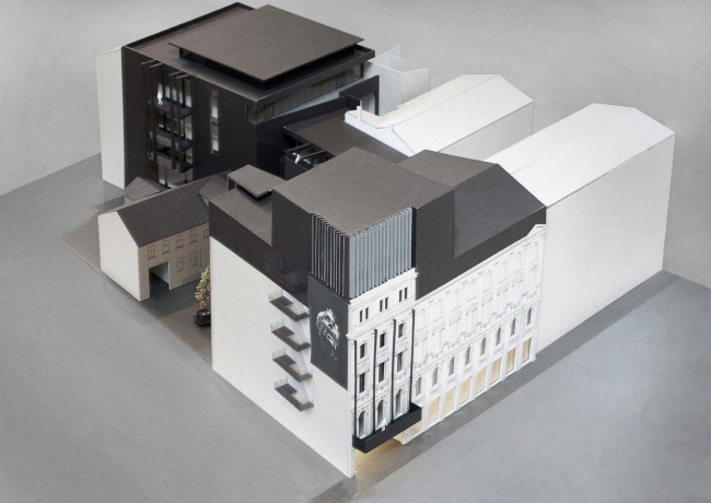 (Rāda maketu.) Pirmkārt pārcelsim ieeju, jo tā nav īsta teātra ieeja. Faktiski tas bija parasts īres nams, kas tika būvēts latviešu amatnieku biedrībai, un pēc teātra tas neizskatās. Mēģinājām pārveidot, lai tas izskatās nevis kā parasta ielas māja, bet kā teātris. Kad māja tika uzbūvēta 19. gadsimta beigās, pirmajā stāvā vestibilā bija restorāns, otrajā stāvā – darījumu zāle, ko pazīstam kā Kolonnu zāli, un augšā – [teātra] zāle. Zāle bija bez pacēluma, tai bija balkoni – tā bija liela sanākšanas zāle. Mēs vispirms pārvietojam teātra ieeju uz vārtrūmi, kas ved uz pagalmu. Fasādes daļa virs tā būs nedaudz izvirzīta, lai saprastu, ka tā ir teātra ieeja. Publika tiek attiecīgi pārcelta no pirmā stāva vestibila uz pagalmu, kur var normāli sarunāties un netraucē ielas troksnis. Virs ieejas arī būs balkons un iespēja fasādes garumā uzlikt afišu, jo pašlaik teātrim tādas iespējas nav. Ja es braucu gar Nacionālo vai Dailes teātri, es zinu, ko tur uzved, ar JRT tā nav.