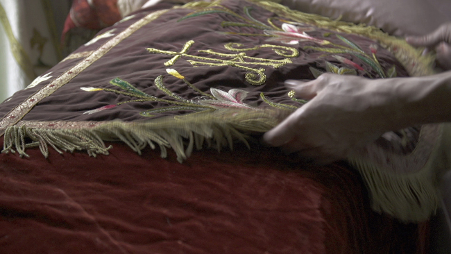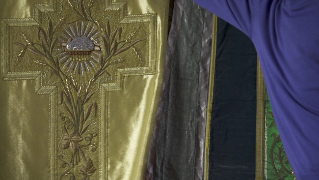 Nu video darbā “Atteikšanās” var labi redzēt manu mīlestību pret tekstilu. Braucot filmēt testa kadrus es nemaz nezināju, ka priesterim Andrim ir tāda kolekcija, īsta Pandoras lāde! Vēlāk, kad jau filmējām, lūdzu viņam lēnām izklāt krāšņos audumus, lai justu to pieskārienu, materialitāti, skaņu. Filmējot var it kā noglāstīt – gleznot ar kameru, uzburt atmosfēru.