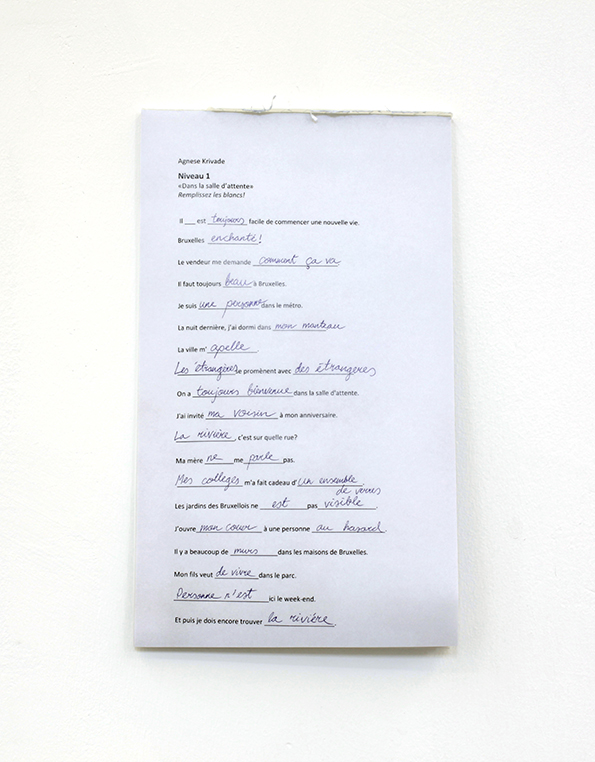 Kad atlases process bija jau daudzmaz pabeigts, man ienāca prātā iesaistīt Agnesi Krivadi, arī uz nenoteiktu laiku Briselē iebraucēja statusā dzīvojošo kritisko un dzēlīgo dzejnieci. Viņa tobrīd arī bija laika trūkumā, tomēr ieinteresējās sacerēt izstādei tādu kā dzejisku repliku par franču valodas apguves kursā iekļautajiem trafaretajiem uzdevumiem, kam visi ir spiesti iziet cauri uzsākot dzīvi citā valstī. Sanāca asprātīgi un absurdi teikumi: “Briselē vienmēr spīd saule”, “Mans dēls grib dzīvot parkā” utt. Izstādē teksts tika eksponēts pie sienas uz noplēšamā bloka lapām.