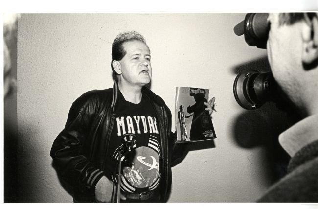 Indulis Bilzēns Rīgā 1992. gadā Viļņa Zābera un Miervalža Poļa izstādes atklāšanā galerijā „Kolonna“. Foto no Jura Boiko ģimenes arhīva