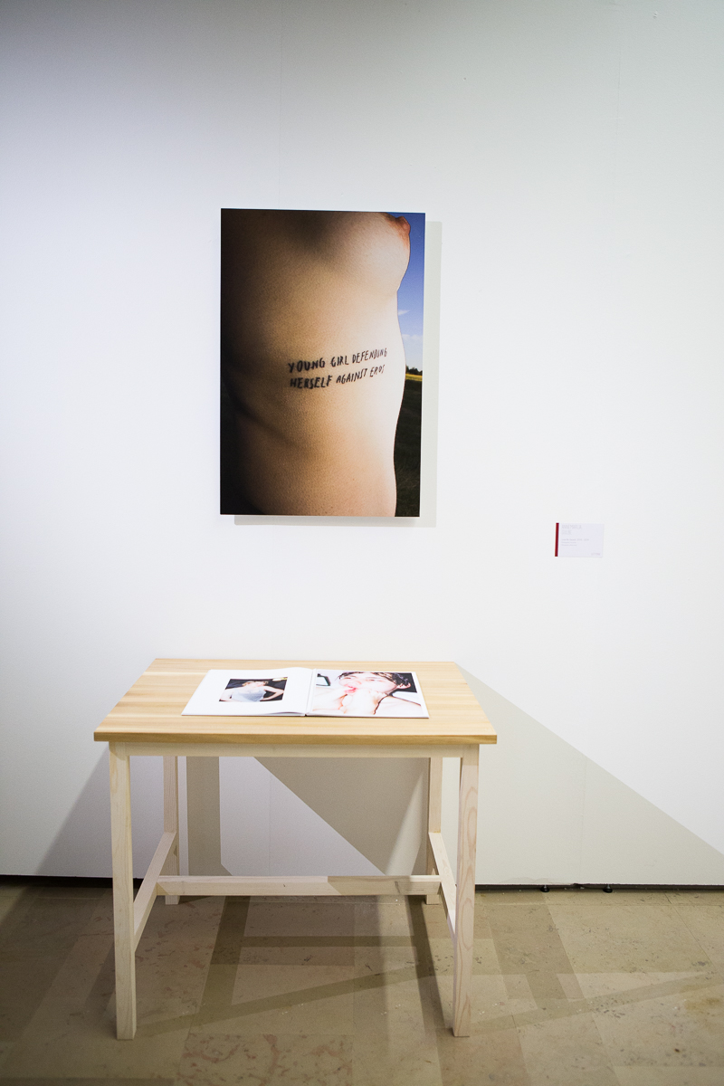 Fotogrāfe Annemarija Gulbe biennālē prezentē fotogrāfiju sēriju Love Re-Search, kurā dokumentē savas paaudzes ikdienas ainas. Būdama vienlaikus tās pārstāve un vērotāja, māksliniece caur fotogrāfiju tiecas izprast savu distancēšanos no mīlestības koncepta. “Fotografēju vienaudžus, kas hormonu, alkohola vai citu vielu iespaidā klaji pauž savu seksualitāti. Šķietami vuāristiskais vērojums patiesībā ir romantizētu ideju analīze. Es mēģinu izprast savu pozīciju, savu neieinteresētību, iespējamo aromantiskumu vai aseksualitāti.” Gulbes mīlestības (ne)meklējumus papildina pašportrets, kurā māksliniece, iedvesmojoties no Love Re-Search projekta, redzama ar ietetovētu frāzi Young Girl Defending Herself Against Eros, kas aizgūta no nejauši pamanīta franču akadēmisma stila parauga.