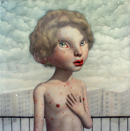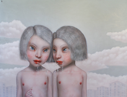 Viņu neproporcionāli lielajās, ieslīpajās, sastingušajās acīs māksliniece iezīmējusi zvaigznītes, kas pauž naivu sapņainumu, atgādinot multiplikāciju filmu estētiku. Vienlaikus acu izteiksme ir atsvešināta, jo šie varoņi, kā atzīst māksliniece, ir “iztraucēti, veicot kādu sev vien saprotamu darbību, rituālu vai meditāciju”. Mazās, šaudīgās mēlītes, siekalu pilieni, pietūkušie acu kaktiņi un sīkas brūcītes, kas klāj sniegbalto ādu, māksliniece izzīmējusi ar milzu rūpību un precizitāti, un tieši šīs detaļas uzdzen vislielākos šermuļus. Diezgan grūti pārvarēt arī niezes, salšanas vai sasprēgājušu lūpu sajūtu, ko šie darbi tiecas atmodināt. Turklāt pamestajās, vientuļajās ainavās agresīvie sarkanie akcenti – matos iesietā lente, nolakotie nagi vai asiņu lāses (arī galerijas stūrī vāzē stāvēja sarkans amarillis) – tikai pastiprina briesmu klātbūtni, kurām šīs dīvainās būtnes tiks (vai jau tiek) pakļautas.