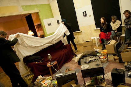Ekskursijas gaita saplūst centrālajā, lielākajā istabā, kuras vidū izveidots mākslinieka-bohēmista miteklis. Dīvāns, tam apkārt daudz dažāda izmēra pudeļu, kaudze ar žurnāliem “Avots” un grāmatas, grāmatas, magnetofona lentes, grāmatas. Arī pats magnetofons. Piegājis pie tā, galvenais varonis parakājas kastēs un izvēlas kādu īpašu lentu, un ar lietpratēja žiglumu uzstāda vijīgo informācijas nesēju uz motoriņu uzmavām. Atskan paša Leščinska descentā un dobjā balss: “Man šodien palika 39 gadi.” “Labs iemesls,” apstādinādams lenti, viņš nosaka un atkorķē Mokas pudeli, palaizdams to pa apli. Ķēdītē iesaistās mazas plastmasas glāzītes. Rodas sadzīviskas mikroainiņas – cienīgas kundzes nervozi pietur pudeles kakliņu, kad blakussēdošie jaunekļi džentlmeniski tās apkalpo. Kāds jau paspējis sev atvēlēto dozu izraut un nu skumīgi raugās tukšajā trauciņā. Saldais, tomēr diezgan stiprais alkohols uzjundī pacilājošas, apcerīgas domas. Un no jaunā Leona dzīves skatītājs tiek aizvests pavisam citā virzienā. Nav skaidrs, kurā un pie kā tieši. Tiem, kuri iepazinušies ar projekta ideju, ir zināms, ka jārēķinās ar Semjuela Beketa darbu “Krapa pēdējā lente”. Dažiem tas nav zināms, esmu viņu skaitā (varbūt, ka vienīgais tāds). Un tad šķiet, ka stāsts par vīrieti, kas apcer, cik stundas no savas pēdējā laika dzīves viņš pavadījis reibumā, tā vai citādi ir par Leščinski, nevis kādu tur Krapu. Tāpat liekas arī par to stāstu, kurā vīrietis un sieviete brauc laivā pa upi saulainā dienā. Tas, ka stāstījums dzirdams magnetofona ierakstā, veicina atsvešinātību. Arvien vairāk jāsāk pieņemt, ka šeit tiek runāts “caur pirkstiem” vai “jālasa starp rindiņām”. Taču, kad varonis, apstādinot lenti, apsver, “vai nevajadzētu tam visam beidzot pielikt punktu”, kļūst nedaudz neomulīgi.