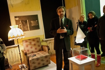 Leons Leščinskis ir labs stāstnieks, tomēr viņa runa ir teatrāla, kas traucē veidoties pilnīgai empātijai. Aktiera bērnības detaļas ir sirsnīgas un bieži papildinātas ar smeldzīgu humoru, toties to izklāsts – pilns uzsvariem, kādi raksturīgi, piemēram, Lielo Aktieru Lielajās Jubilejās, kuru ierakstus varbūt būsim redzējuši kādā teātra vēstures televīzijas raidījumā. “Es esmu pret jums patiess, bet ne līdz galam,” tāda ir zemsvītras piezīme saviesīgajam ekskursijas tekstam. Protams, es negaidīju kādu galējību: atklātas asaras vai pārāk garu anekdoti no studiju laikiem, taču aktierspēles tehnikas rudimentu klātbūtne formāli ļoti pietuvinātajā un privātajā izstādē radīja diskomfortu. Droši vien tas ir kas līdzīgs stāstiem par ķirurgiem, kuri tirgus stendā pamana pavirši atdalītu filejas gabalu, vai ugunsdzēsējiem, kuri viesībās kritizē namatēvu par nepareizu vietu kamīnam. Profesija nāk līdzi ar to raksturojošiem, tipoloģiskiem uzslāņojumiem.