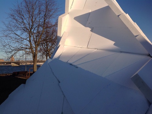 Tā kā biju ierobežots, bija ļoti precīzi jāizkalkulē, ko varu atļauties. Finālā izmantoju vienkāršāko, piezemētāko tehnoloģiju, ko izmanto celtniecībā, precīzāk, ātrās konstrukcijas māju būvniecībā – koka karkasu, kas apšūts ar vieglu izolējošo materiālu, proti, putuplastu. Tas labi asociējas ar kaut ko aukstu, ar ledu un sniegu. Nav mazsvarīgi, ka šāda konstrukcija arī peld. Elementāra loģika – kā mēs būvējam mājas, tā arī taisām mākslu. Ko vari atļauties, ar to arī būvē.