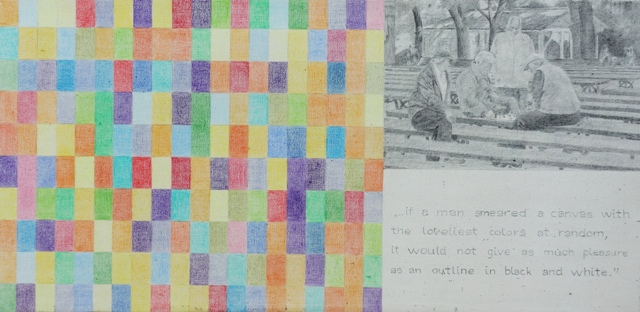 “Arturs Bērziņš šajā izstādē jaunā līmenī demonstrē savu tehniku. Tā šoreiz ir salikta, proti, zīmuļa zīmējums uz koka dēlīšiem un... – filozofisku tekstu lasīšana un refleksija par tiem. (Tehnikas otro sastāvdaļu, piebildīšu, reti kurš mākslinieks ir apguvis.) Zīmējumi nav ilustrācijas filozofiskām (Platona, Aristoteļa, ... Vitgenšteina) teorijām – zīmējumi ir filozofiska domāšana ar vizuālās izteiksmes līdzekļu palīdzību. To varētu pateikt arī ar paradoksa palīdzību: Kants varētu nonākt pie savas teorijas par telpu kā tikai mūsu uzskates jeb vērojuma (Anschauung) formu, skatoties uz Artura Bērziņa vienu no zīmējumiem šajā izstādē, taču, būdams ģeniāls domātājs, izdarījis to neatkarīgi un pirms Bērziņa,” skaidro Jānis Taurens.