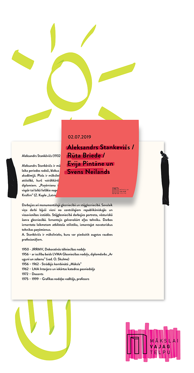 No 2. jūlija MVT Vasaras mājā būs skatāma otrā izstāde izstāžu ciklā “LMA100”, šoreiz prožektoru gaismā izceļot mākslinieku Aleksandru Stankeviču, kura daiļradi interpretēs māksliniece, ilustratore un scenogrāfe Rūta Briede kopā ar saviem studentiem no Latvijas Mākslas akadēmijas (LMA) Eviju Pintāni, Svenu Neilandu un mākslinieci Annu Zvaigzni.
