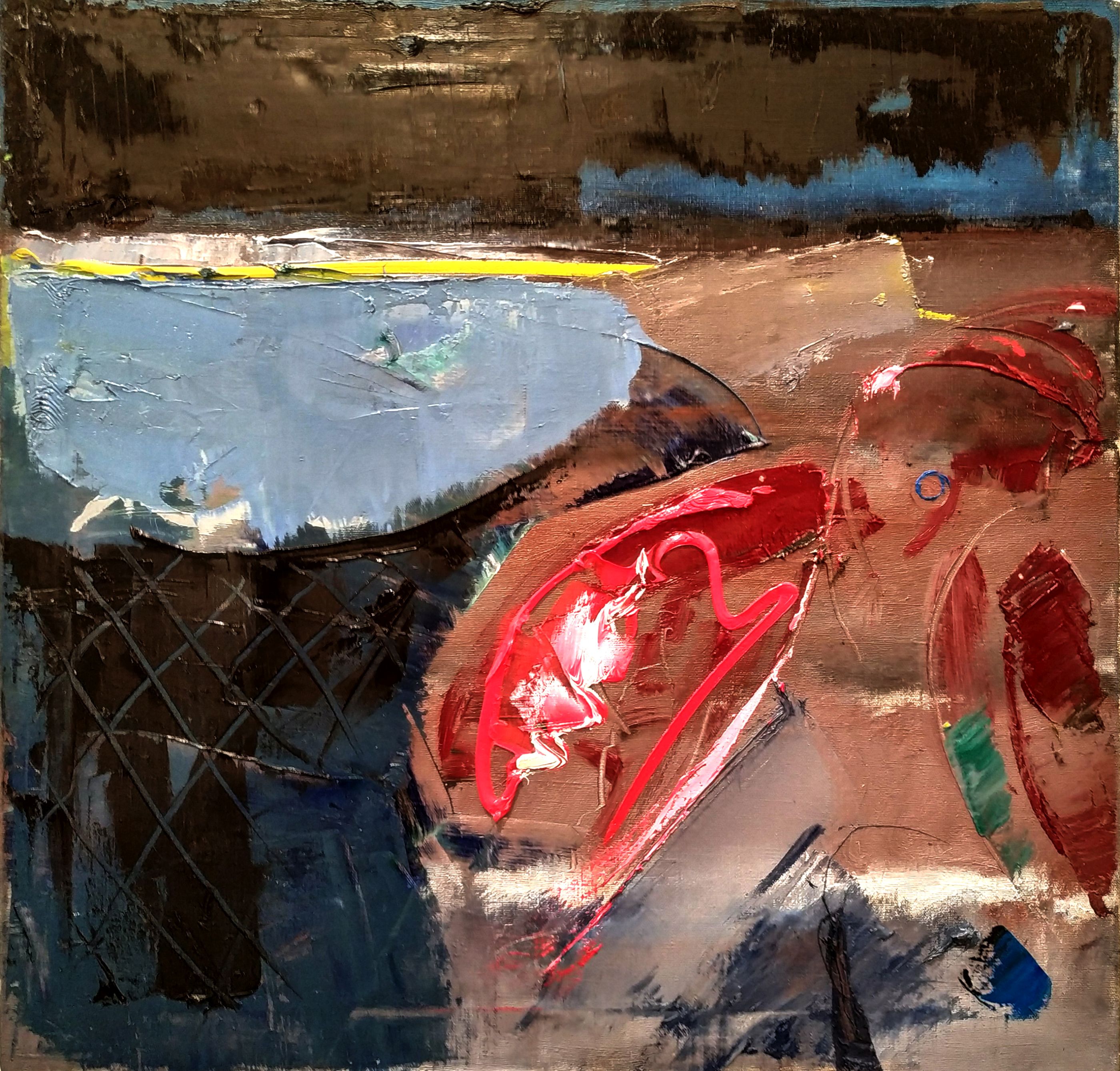 Dina Dubiņa. Ceļš. 2019. Dzintars, grafīts, zelts, akrils, 100 x 100 cm, autortehnika
