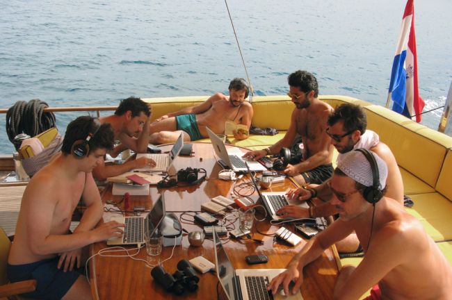 Предлагаю начать знакомство с творчеством Soundwalk Collective с путешествия Одиссея – Ulysses Syndrome. Ребята два месяца плавали на рыбацком кораблике по Средиземному морю, повторяя маршрут Одиссея, вооруженные сканерами радиоволн, записывая эфир, а также звуки волн, птиц, корабля, окружающей среды во время вылазок на берег, собрав в результате коллекцию на 1500 часов. Записав избранные фрагменты на винил, организовали серию выступлений, сопроводив живой микс видео- и фотопроекциями, а иногда даже перформансами. Одно из таких фееричных выступлений – на плавучем маяке на реке Гудзон в Нью-Йорке – было прекрасным образом запечатлено в фильме Джима Хелтона (первые 14 минут – фрагменты репетиций, если скучно, просто промотайте). Потрясающе богатый видео- и аудиоряд!