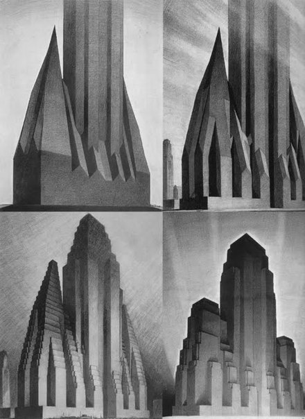 Всё это отчасти романтично, но романтика им тогда была свойствена. Просперити, Век джаза, то да сё. До Великой депрессии. Депрессия, впрочем, Феррису даже помогла – город затих, никто не строил, но рисовать-то было возможно. Разумеется, он не был первым бумажным архитектором. Был хотя бы и Пиранезе, который тут вполне уместен. По пафосу небоскрёбы – отчасти его тюрьмы, только вывернутые: вместо гигантских внутренностей – громадные массы. Пиранезе там, конечно, знали. Ну, а ещё и рисунки углём по бумаге – конечно, будет похоже.