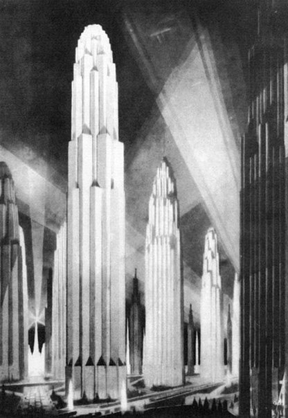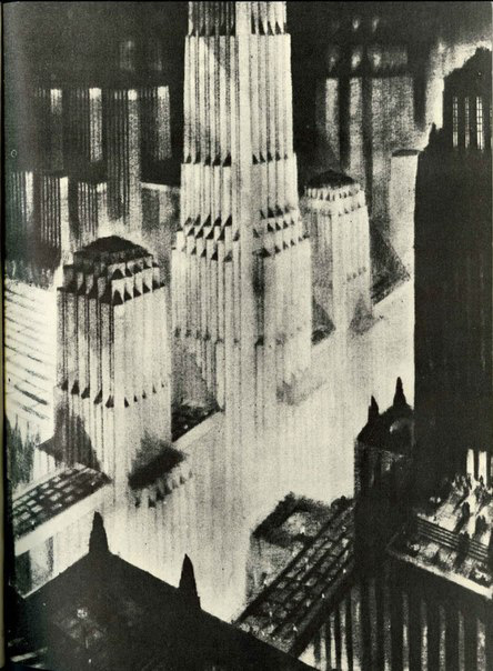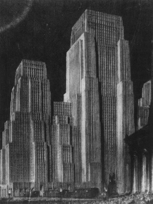 Тогда Феррис сделал шаг в сторону и ушёл из архитекторов в рисовальщики. В Википедии род его деятельности называют достаточно странным словом, им даже самим пришлось дать пояснение: «Hugh Ferriss (1889–1962) was an American delineator (one who creates perspective drawings of buildings) and architect».