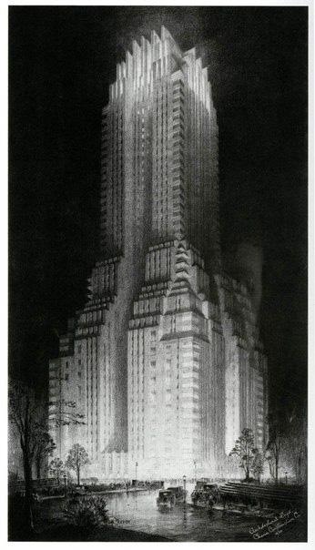 Но там не всё так романтично, была вторая штука. В 1916-м появились правила, Закон о зонировании, который определял требования к постройкам. Собственно, он и определяет формат американских небоскрёбов, отчего они вот такие – часто пирамидками в той или иной степени, особенно межвоенного времени. Так что Феррис не рисовал миражи, а давал – как выражается тот же Колхас – «оболочки». То есть возможные объёмы в полном соответствии с уложением 1916-го. А последовательные уточнения оболочек приводит уже к чему-то, уже почти реальному. Конечно, архитекторы могли использовать его рисунки как каталог возможностей.