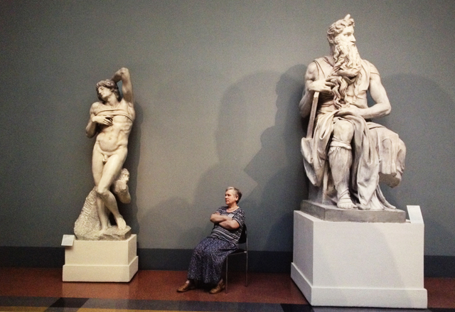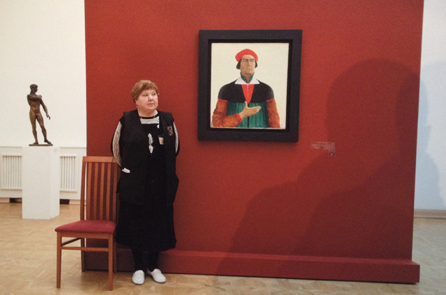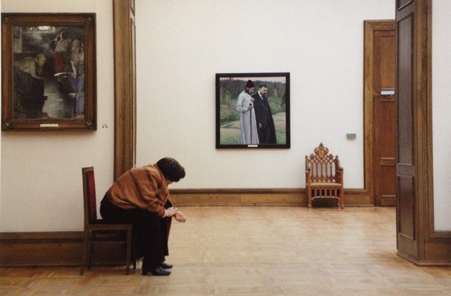 Ой, это ещё не все претензии. Насколько помню, в российских музеях не очень-то склонны позволять фотографировать. Ну, может, мобильником исподтишка (без вспышки, конечно). Тем более – на профессиональную аппаратуру. Так что автору надо было добыть разрешение на съёмку, оплатить её, после чего осуществлять съёмочный процесс: штатив, наверное, ставить, освещение. Это к тому, что сочетание картин и смотрительниц вовсе не случайно возникшее. Всё выстроено: подбирал по фактуре, усаживал в позы. Конечно, постановка – там же пусто, а в этих музеях так не бывает. Получал разрешение, проводил кастинги, подбирая их к картинам. Да-да, теперь постановочность и документальность строго не разводятся, такой исторический период. Собственно, логично: постановка сама по себе тоже какой-то факт жизни. Только есть разница: если бы все эти картины и персонажи возникли бы как-то упс! – и возникли: была бы одна история. А в таком варианте автор сделал некий сувенир «из Раши с Высоким».