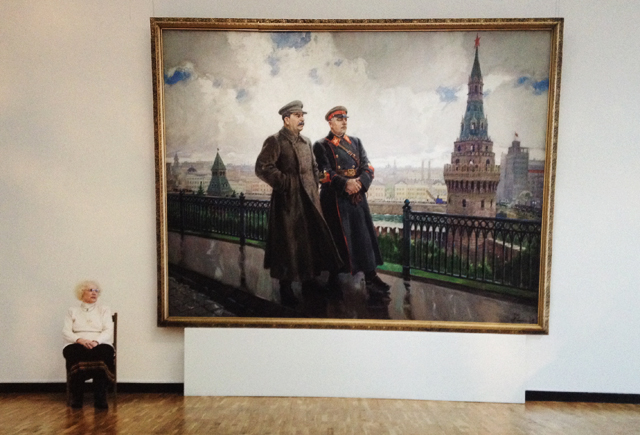 Ну вот он тоже строил какую-то схожую линию. То есть не так, чтобы портретно – как подобрать смотрительницу, похожую на двойной портрет Сталина и Ворошилова? Как-то по фактуре и общему соответствию. Ну, удивился, что сидят, затем как-то обратил внимание на определённое сходство сидящей и изображённого и стал разрабатывать тему. И, что ему в плюс, – у него трудозатраты. Сидящих можно было бы отснять в одном музее, а у него и Эрмитаж, и Третьякова, и Пушкинский, и Русский.