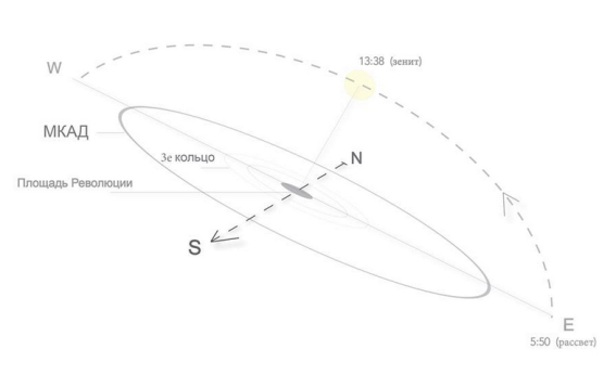 Но, даже главное, акция ad def углубляется в самих авторов. Вообще это странная акция – вот не сказать, удачная она или нет. Потому что для таких вариантов в РФ сейчас нет рамки. То есть должна же быть рамка, в которой можно интерпретировать что угодно, внедряя туда собственную рефлексию, – даже если акцию не видел, а просто читая описания. Тут описания ясности не добавят (конечно, они же не попадают в привычный контекст): «Маршрут пролегает по оси, перпендикулярной проекции оси движения Солнца, длина составляет около 45 километров». В момент прохождения через Площадь Революции солнце должно было оказаться в зените.