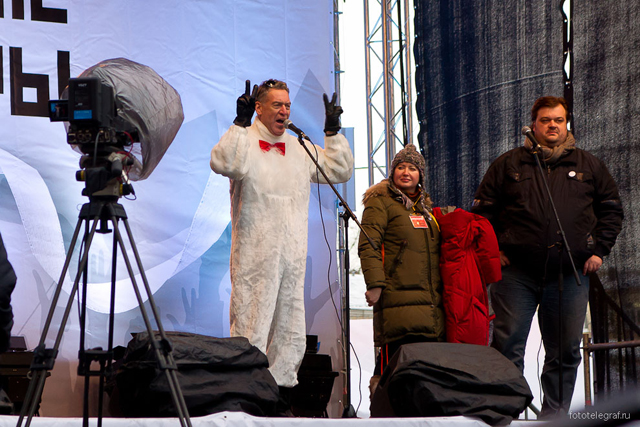 То есть (по мне) ситуация-граница состояла в том, что акционизм начал принимать формы, не отличимые от публицистических высказываний и унылого стёба – ранее к искусству отнесено это быть не могло. Чуть популяризируя ситуацию: всякие протестные креативы времён митингов на Сахарова были по факту КВНом и уничижали креатив как таковой. Скажем, следующая фотография подписана так: «Артемий Троицкий вышел на сцену в образе презерватива – напоминание об оскорбительном высказывании Путина в адрес митингующих».