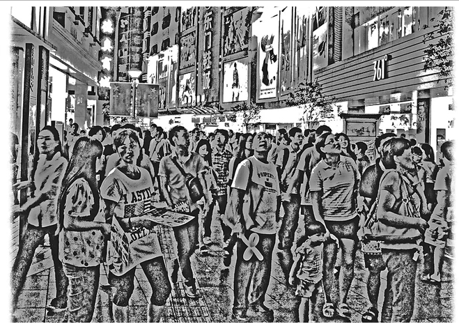 Впрочем, вот тут в самом деле мрачняк или нет? Что определяет мрачняк – толпы народа в одну сторону как автоматы, всё черно-белое и темное с вкраплениями цветного, тоже не сияющего. Но, в принципе, и что? Из чего следует, что это должно производить мрачняк? Темно – так погода такая. Толпы — людей там много, а им самим и не ужасно, не сбегают же всё-таки. Просто отношения и чувства строятся уже внутри ситуации, а она вот такая. Они в этом пространстве живут, а оно вот такое. Имела ли в виду мрачняк сама Oldaker? Мало того, вот следующая картинка – уже не её, моя фотография.