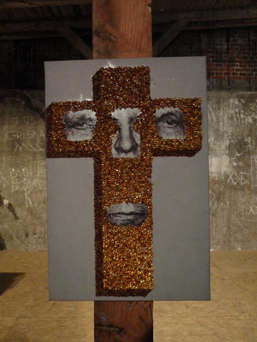 К каждому художнику мы нарисовали картину, на которой изображено то, что в большей степени соответствует этому автору, а самые важные, проблемные части изображения выделили янтарной россыпью. Вот, например, картина о Юрге Бариляйте – живописце и перформансистке. Работы Юрги очень женские, эмоциональные, она всё время на грани, она словно пытается охватить необъятное, дотянуться до горизонта. Один из её известных перформансов – интерпретация народной сказки о двух лягушках, попавших в кувшин с молоком. Юрга буквально барахтается в сосуде с молоком, пытается выбраться из него и прилагает все физические усилия, чтобы молоко от её барахтаний стало сметаной или маслом. Мы взяли стоп-кадр из этого видео, перенесли его на холст и именно края сосуда выделили янтарём. Мне кажется, что получилось довольно красиво. Или, к примеру, живописец Хенрикас Черапас, отличительная визуальная особенность его работ – это очень широкие, густые мазки, краска, стекающая по холсту струями – эти подтеки мы и сделали янтарными. Для разных картин подобран янтарь разной фактуры. На некоторых работах он гладкий, обработанный, очень «животный», напоминающий рыбью икру; на других – грубый, колотый, неоднородный.