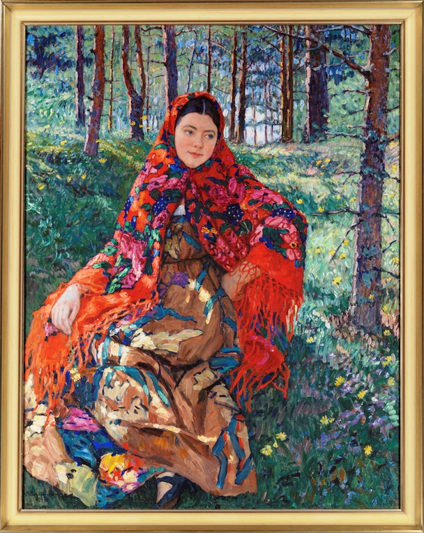 К.Р.: После отъезда гражданской жены Богданова-Бельского в Европу и развода Антонины Эрхардт с Карлом Эрхардтом (Carl Martin Erhardt) уже ничто не мешало их союзу. В 1932-м в Христорождественском соборе состоялось венчание. Антонина до самой смерти мужа была его любимой моделью, музой, первым ценителем его картин и горячей поклонницей. О большом чувстве художника свидетельствуют многочисленные портреты жены. Даже здесь на выставке представлено четыре её портрета, три из них – из коллекции семьи художника. Портрет Антонины, изображённой в русском платке среди сосен, неизменно вызывает восхищение посетителей выставки. Колорит портрета, построенный на сочетании сочных зелёных и красных тонов, передаёт ликующее настроение влюблённого художника. Искренние теплые отношения сложились у художника и с сыновьями Антонины, они также часто были героями его картин.
