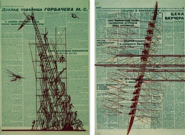 Есть пара совсем старых работ из периода занятий «бумажной архитектурой», тоже на тему Башни. Одна из них – 1988 года из серии «Временных монументов». Это вышка для испытаний «Летатлина». Владимир Татлин в своё время не смог этого сделать, а здесь – вот вышка из строительных лесов, вот лестницы ведут на верхнюю площадку, вот люди карабкаются, вот на стреле подъёмного крана подвешен знаменитый глайдер, а в нём человек ждет, когда поднимется ветер… Другой экземпляр этого проекта, напечатанный на газете, отправляется сейчас на выставку и в коллекцию Центра Помпиду.