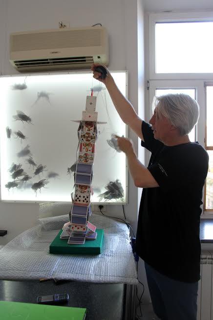Есть ещё Catapultower, самовозводящийся карточный дом. Тянешь за нитку – башня поднимается. И не падает, в отличие от обычных карточных домов. Появился в 1982 году, был сделан для конкурса журнала Architectural design. В «строительстве» помогал известный российский кинетист Слава Колейчук, с которым я в то время работал в институте технической эстетики (ВНИИТЭ – Лиза Боровикова). Кажется, что это игрушка, однако текст о ней недавно написал Майкл Гован, директор одного из крупнейших американских музеев LACMA, причём опубликован он в сборнике крупной архитектурно-строительной компании SOM, специализирующейся на строительстве небоскребов.