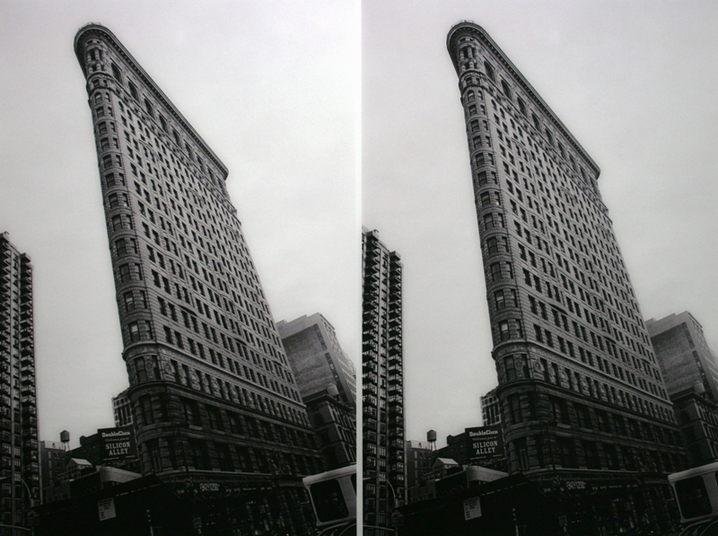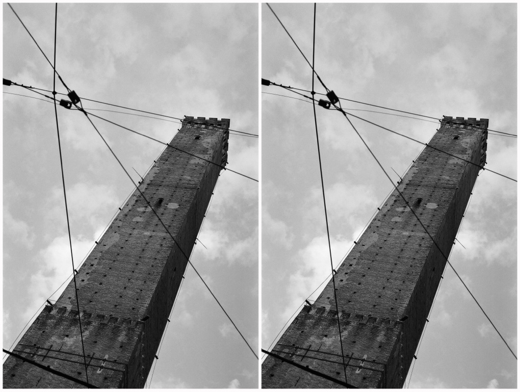 Серия «Башни-близнецы» – это те же самые башни, только скомпонованные попарно. Смотрите на такую «стереопару» и видите, что одна башня падает заметнее, чем другая. Глаз беспокойно начинает искать в картинках отличия, а их нет. Это оптическая иллюзия – фотографии абсолютно идентичны. Эта иллюзия была открыта лет десять назад в Университете Макгилла в Канаде. Человеческий глаз, воспринимающий парную картинку как целое, пытается достроить изображение с помощью перспективного сокращения. Две башни в перспективе должны сходиться. А они не сходятся. Поэтому глаз сбивается и «заваливает» одну из башен. На выставке представлена целая серия «башен-близнецов», они все основаны на этой иллюзии.