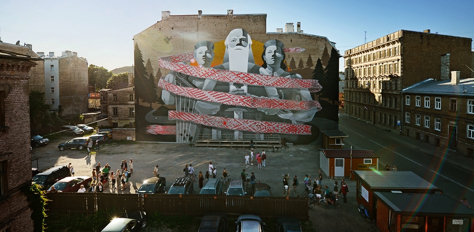 Д.Р.: Политические, наверное, меньше, потому что то, что важно сегодня, уже не будет важно завтра. Если хочешь работать на пяти- или девятиэтажном фасаде, никто тебе не разрешит нарисовать на нём Солвиту Аболтиню с хоботом, как у мамонта, например. Не выйдет! Поэтому нужно быть довольно самокритичным, чтобы всё это не стало твоим последним фасадом. Есть темы, которых не стоит касаться, чтобы не получить цензурой по башке, на чём тогда всё у тебя и закончится. В Латвии много таких чувствительных точек. Поскольку настенная живопись у нас пока не очень распространена, нельзя себе позволить делать абсолютно всё. По крайней мере, вначале стоит не разбрасываться.