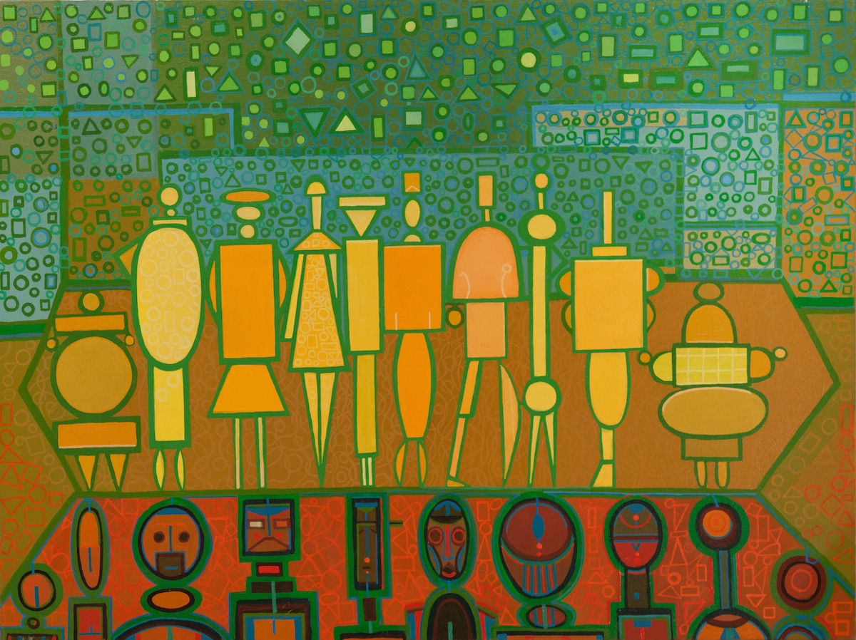 Кстати, это никак не «орнамент», это часть пространственной трактовки поверхности. Можно назвать это «языком звёздной пыли». Художник думает, что земной мир и его формы тесно связаны с космосом и его влиянием, и художник отражает это условным геометрическим способом.