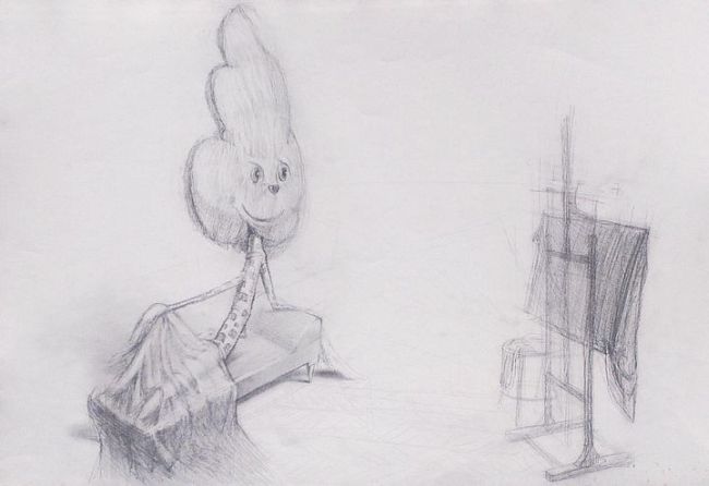 К выставке сделан буклет, написанный художником, он как раз и содержит изложенные на одиннадцати страницах вопросы, перемежающиеся иллюстрациями. Это оказывается отдельным увлекательным чтением, раскрывающим весь сюжет выставки, – рассказывали, что преподаватели из художественной школы просили его составить вопросы для занятий с учениками (к вернисажу был напечатан единственный экземпляр). И действительно, текст Тавасиева – это нечто вроде пособия с вопросами для самостоятельной работы. Если читать его подряд, то возникает впечатление, что художнику очень хочется переложить часть ответов на вопросы на зрителя, он захлёбывается в вопросах.